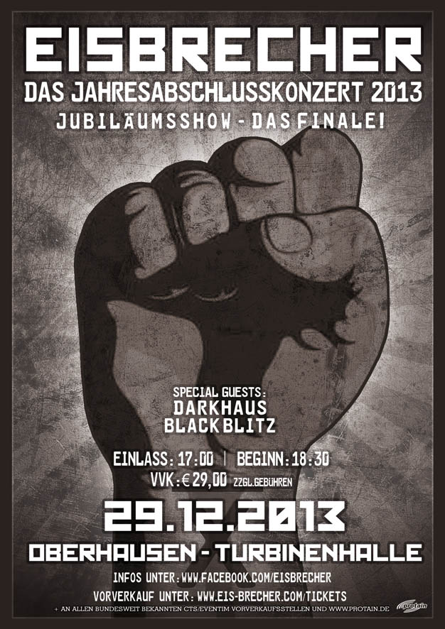 Zum Ende ihres Jubiläumsjahres heizen Euch EISBRECHER aber noch ein weiteres Mal ein und laden mit dem Finale ihrer Jubiläumsshow am 29. Dezember zum großen Jahresabschlusskonzert 2013. Nach den legendären Abschlussshows in München (2012) mit über 3.500 Fans und Stuttgart (2009 & 2010 – jeweils ausverkauft!) wurde dieses Mal die Turbinenhalle Oberhausen als Final-Ort auserkoren. Als Gäste werden DARKHAUS und BLACK BLITZ mit von der Partie sein.